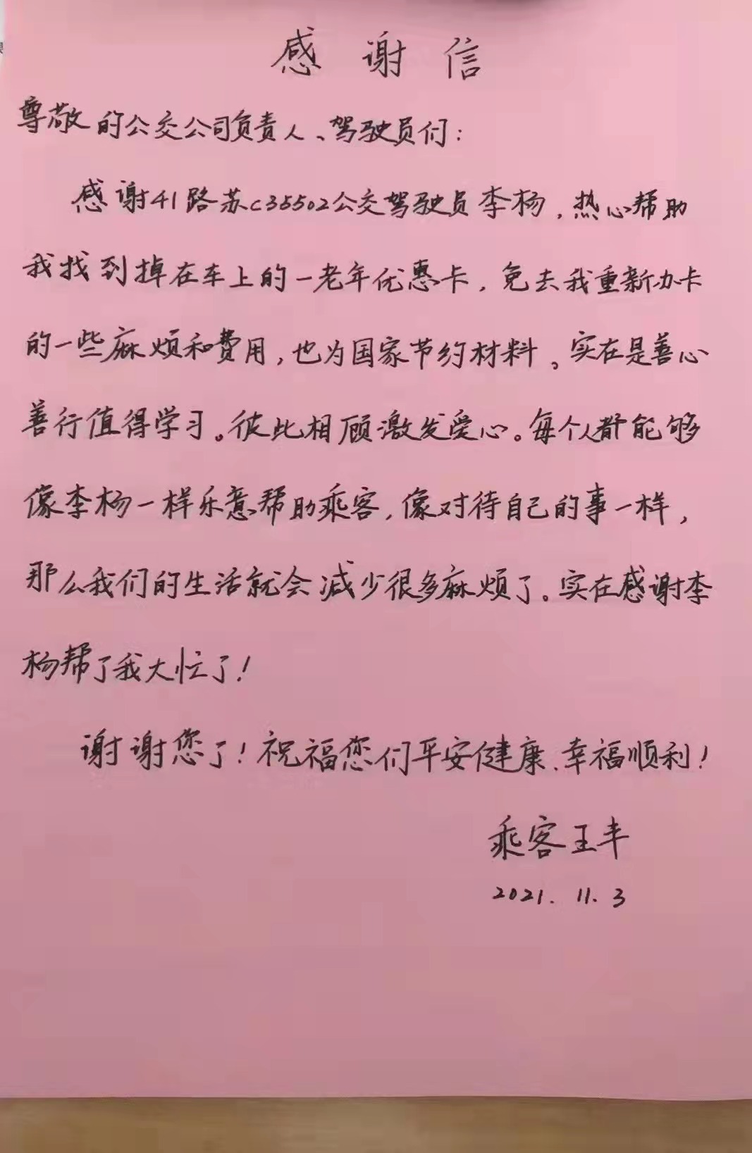 新區(qū)公司駕駛員李楊駕駛41路蘇C35502號車,行駛至銀湖小區(qū)站臺時,乘客王女士向其求助。王女士告訴駕駛員,早晨10點20分左右,她乘坐41路公交車時,不慎將老年優(yōu)惠卡丟在了車上,希望李楊幫她尋找一下。李楊留下了王女士的電話,待車輛到達建筑學院后,李楊立即去調度室尋找,根據(jù)王女士提供的乘車時間很快鎖定了車輛,經(jīng)詢問,王女士的老年優(yōu)惠卡已被駕駛員交到了調度室妥善保管。11月3日下午,王女士取回了失而復得的老年優(yōu)惠卡,并送來感謝信。