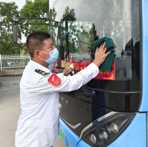 在淮海文博園公交樞紐站內(nèi),81路駕駛員謝新建正在車廂內(nèi)消毒,中午的車場經(jīng)過烈日炙烤,地表溫度有50多度,為了能給乘客提供一個舒適、安全的乘車環(huán)境,謝新建每班發(fā)車前都會提前上車檢查車輛設(shè)施設(shè)備、將車廂內(nèi)外打掃干凈,提前打開空調(diào),身上衣服濕了又干、干了又濕······
