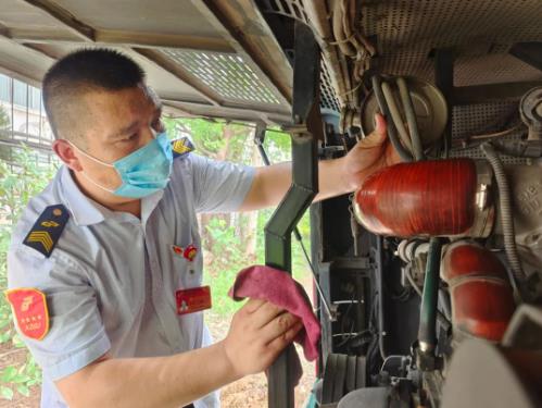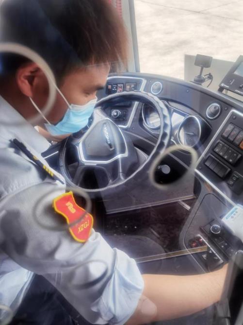 新區(qū)公司1780車駕駛員白延奇駕駛的19路線,由銅山新區(qū)總站發(fā)往徐州火車站,全程接近30.5公里,途徑居民區(qū)、學(xué)校眾多,每天要跑3趟,6個單程,不堵車的時候一個單程需要一個小時。“由于工作的特殊性,即便天氣再熱我們也不敢多喝水,早晚高峰堵車至少得1個多小時才能回到主站,只有到終點站才能多喝幾口水,抓緊時間上個廁所。”駕駛員白延奇這樣說道。為了給市民乘客提供溫馨、舒適的車廂環(huán)境,每天朝陽還未升起,白延奇就到達停車場,檢查車輛狀況、擦拭發(fā)動機、刷洗輪胎、打掃車輛衛(wèi)生,在確保“五凈一亮”的同時,對車廂進行全面消毒,不一會,白延奇的額頭就布滿了汗珠,身上的行業(yè)服早已濕透,緊緊地貼在皮膚上。