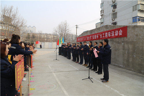 “參賽隊(duì)員各就各位!裁判員準(zhǔn)備計(jì)時(shí)!”運(yùn)動(dòng)會(huì)主持人一聲令下,首先開(kāi)始比拼的項(xiàng)目是需要隊(duì)員齊心協(xié)力,發(fā)揚(yáng)合作精神的“三人四足接力賽”,三人一組紅繩綁腿齊步走,每隊(duì)12名參賽隊(duì)員,比的是速度,更是勁兒往一處使的同心合力?!凹佑?!加油??!”“一二!一二!”比賽場(chǎng)上運(yùn)動(dòng)員的號(hào)子聲和場(chǎng)外女工們的加油聲、歡笑聲交織一起,此起彼伏。