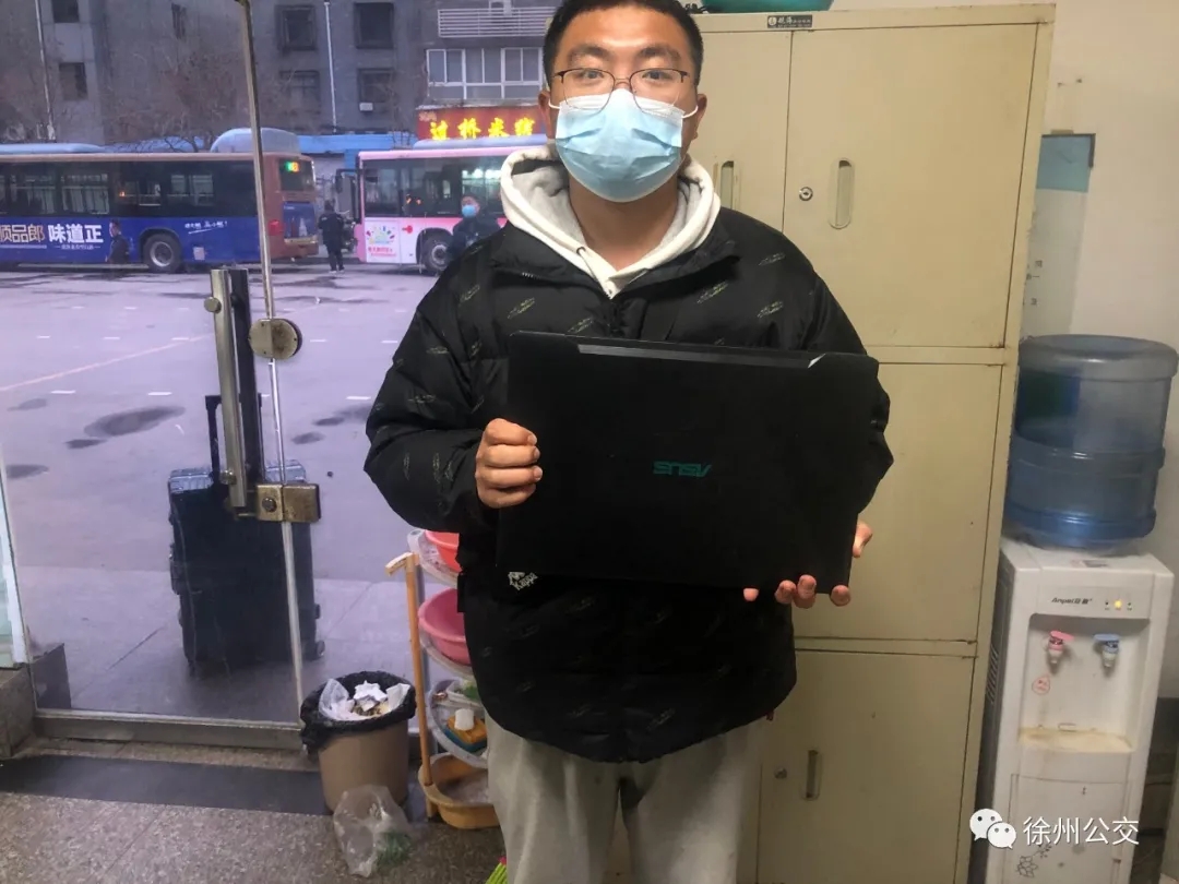 此時(shí),專1路1696號車到達(dá)徐州站,駕駛員王強(qiáng)開始打掃車輛衛(wèi)生、對車廂進(jìn)行通風(fēng)、消毒,忽然,他發(fā)現(xiàn)車廂后座位上有一個藍(lán)色雙肩背包,打開發(fā)現(xiàn)里面有一臺筆記本電腦。王強(qiáng)隨即撥打車隊(duì)電話報(bào)備,并把背包轉(zhuǎn)交給終點(diǎn)站工作人員登記保管。工作人員在包里找到了失主的聯(lián)系方式,很快聯(lián)系到失主陳先生。