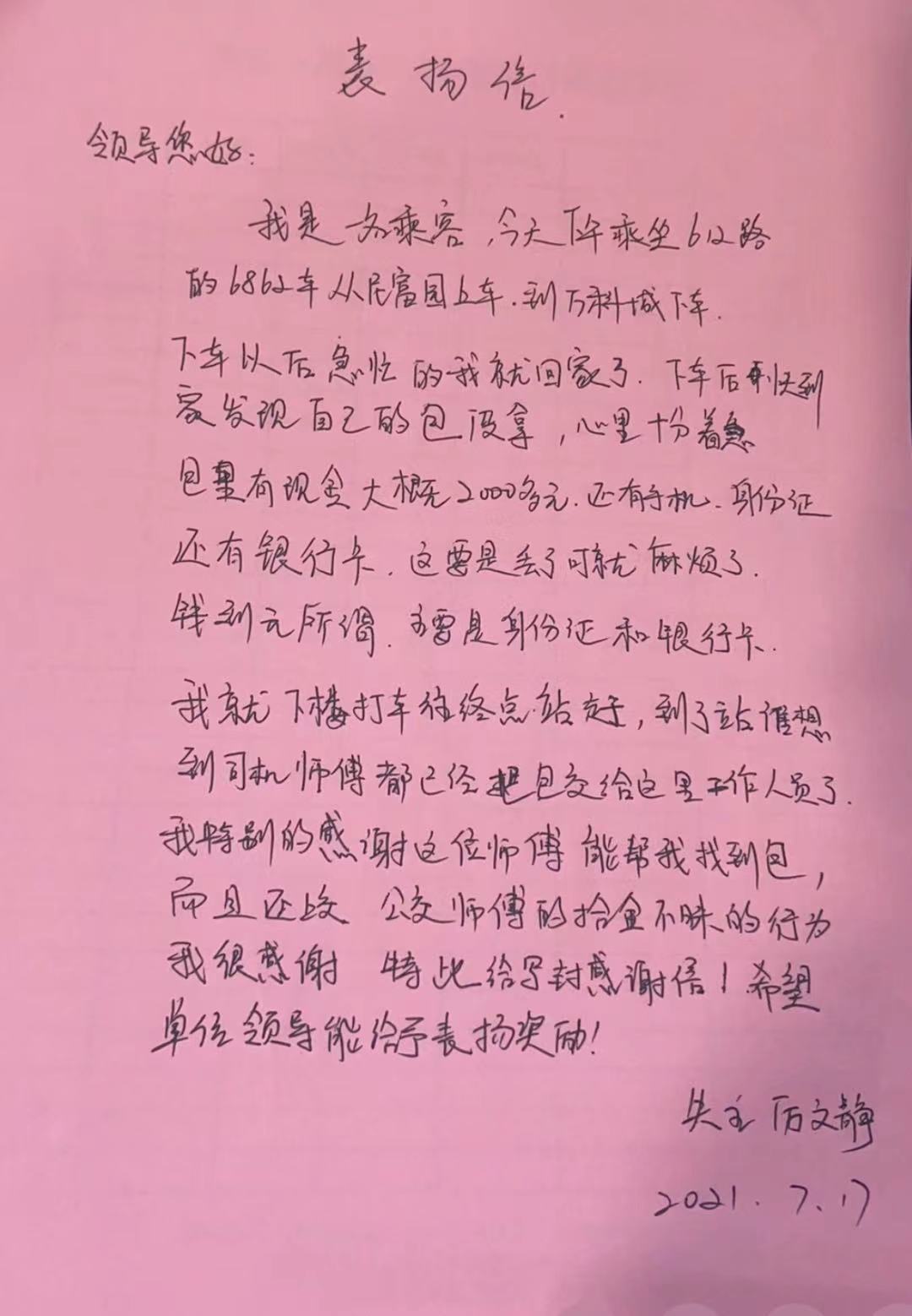 “到家后,我發(fā)現(xiàn)包不見(jiàn),于是抱著試試看的心態(tài),來(lái)到九里停車(chē)場(chǎng)調(diào)度室詢問(wèn),沒(méi)想到好心的公交司機(jī)幫我找到了。”厲大姐緊握王師傅的手連聲致謝,當(dāng)場(chǎng)寫(xiě)下了一封表?yè)P(yáng)信。