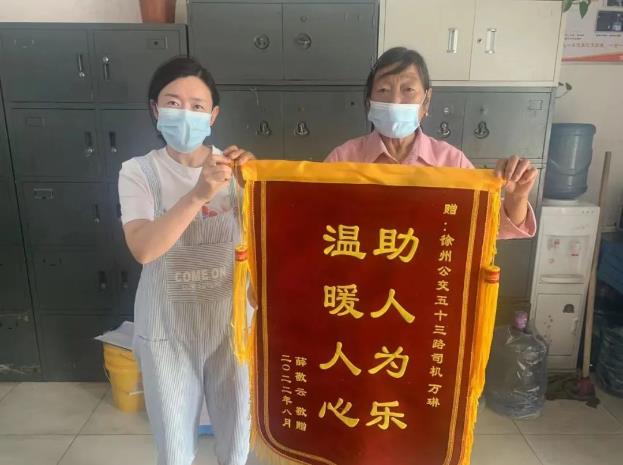 8月28日上午,乘客薛女士手拿著一面印有“助人為樂 溫暖人心”的錦旗來到食品城調(diào)度室,感謝53路駕駛員萬琳。