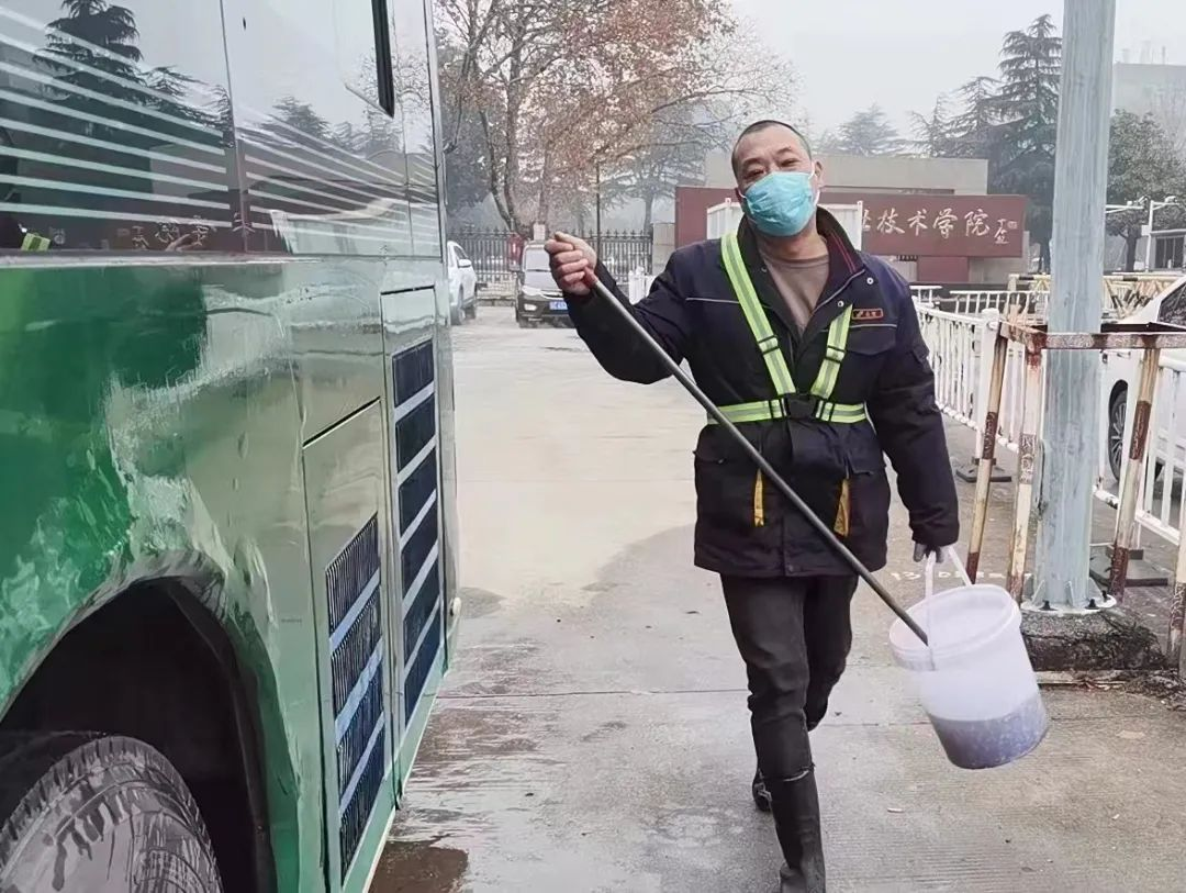 春運期間,為保障廣大市民乘客出行需求,部分公交線路縮短了發(fā)車時間,增加了運營車輛,再加上客流增多,路面擁堵等情況,公交車回到終點站停放的時間很短,又要投入到下一趟的運營當中,這無疑給車輛保潔工作帶來了一定的困難。因此,為確保出場車輛干凈整潔,每天天沒亮,張璞已經(jīng)在建筑學院停車場里忙起來了。只見他一手拿毛刷,一手拎水桶,開始清潔車廂外部,張璞動作嫻熟地擦拭前擋風玻璃、車廂外部兩側(cè),不一會,他的臉上就已掛滿了汗珠,平均一輛車10分鐘的清潔時間,是他十多年工作鍛煉出來的速度。近日氣溫驟降,持續(xù)有冰凍天氣,如果抹布太濕,早晨擦座椅時會粘在上面,為此張璞都會提前準備好潮濕的抹布,既能擦掉扶手、座椅、靠背上的浮塵,還不會留下水漬。像這樣日復(fù)一日的簡單工作,張璞堅持了十多年,他平均每天要打掃23臺車,平均一輛車10分鐘的清潔時間,張璞用自己的勞動,換來了車輛的干凈整潔。