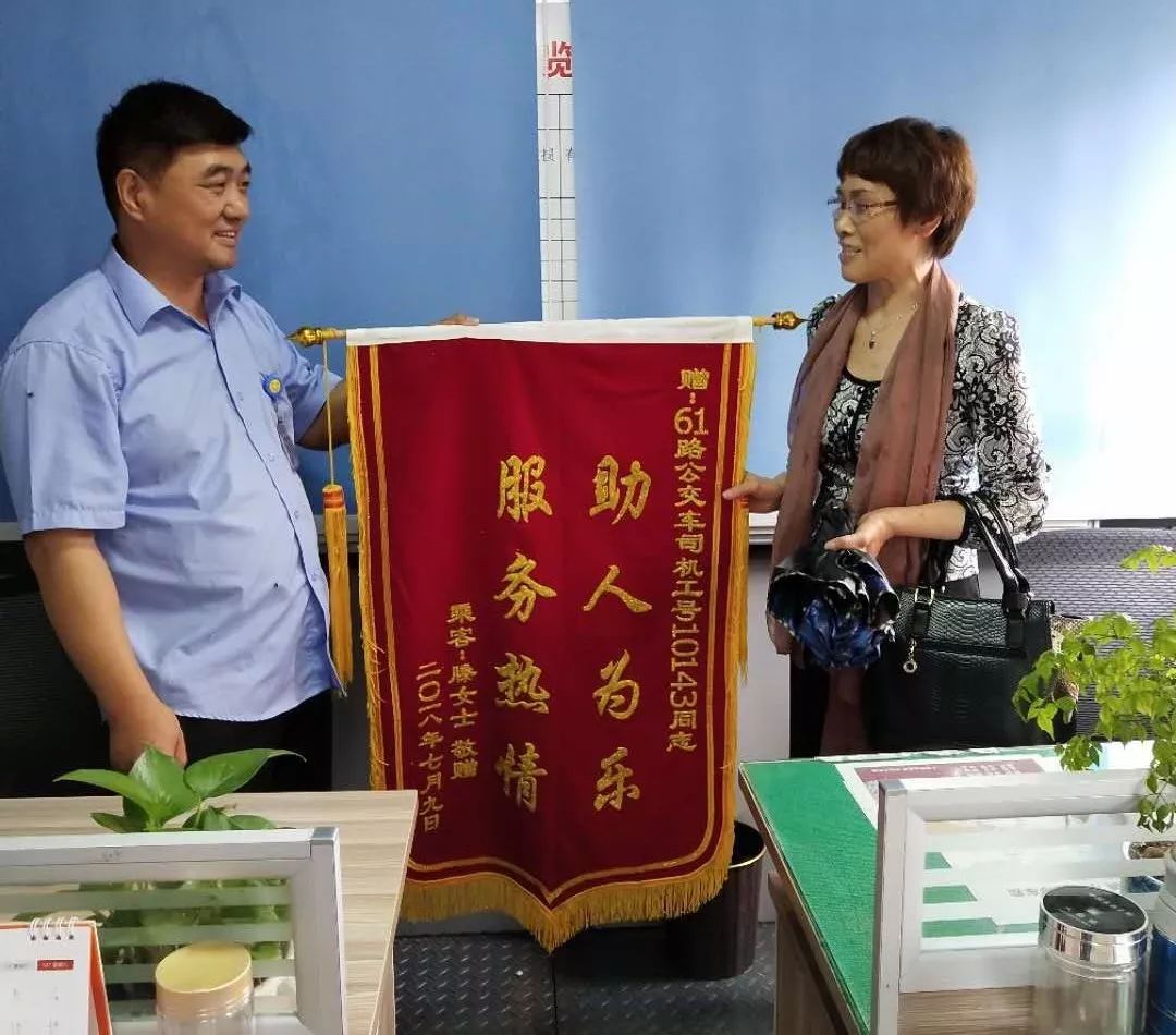 7月9日,市民滕女士到宣武車站,送來(lái)一面錦旗,專門感謝61路駕駛員段世望。