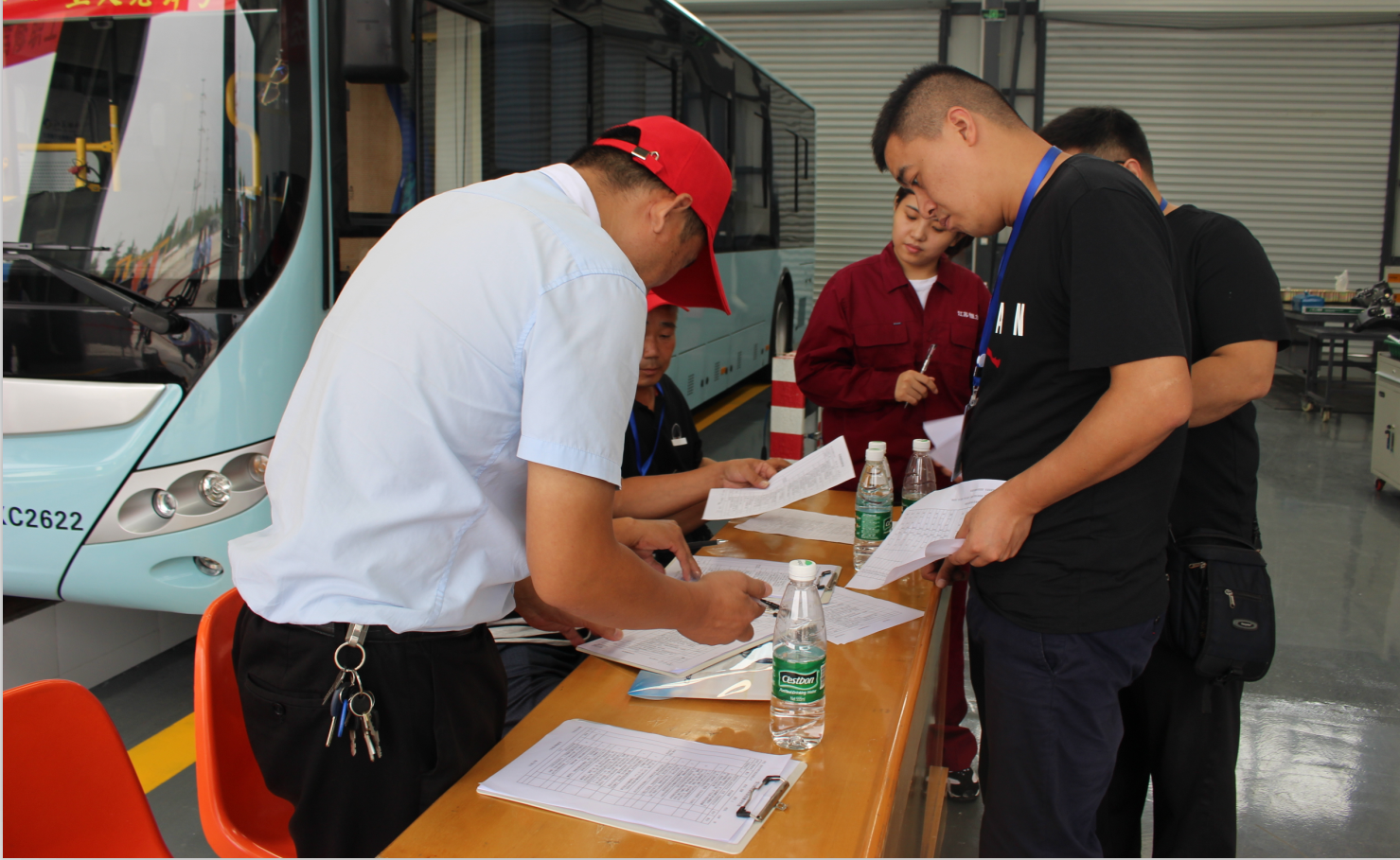 比賽開始了!參賽選手們穿戴整齊的工作服,個(gè)個(gè)卯足了勁,整裝待發(fā)。整潔的維修車間兩個(gè)工作臺上,四組修理人員同時(shí)進(jìn)行盤式制動(dòng)器拆裝組合的項(xiàng)目比賽,四名裁判員認(rèn)真對照標(biāo)準(zhǔn)計(jì)分,現(xiàn)場安靜得只聽見制動(dòng)器拆裝時(shí)輕微的“啪啪”聲。一旁的4個(gè)檢修地溝上,分別停著4輛新能源純電動(dòng)公交車,同時(shí)進(jìn)行著新能源車電控故障排除項(xiàng)目的比賽。參賽人員時(shí)而在駕駛室時(shí)而在車廂尾部檢修電路,裁判員根據(jù)實(shí)際操作隨機(jī)提問、記錄。