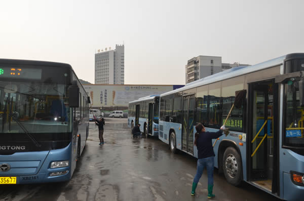 特別是雨后,所有管理人員、調度員、駕乘人員齊上陣,利用休停和晚收車后的時間,加班加點對2300多臺營運車輛和各公交首末站、停車場、調度室等環(huán)境衛(wèi)生進行了徹底的衛(wèi)生大掃除,清理衛(wèi)生死角。由機關職能部室和服務督導隊,以及各營運公司組成檢查組,每天都要在線路開展衛(wèi)生專項檢查。針對檢查中發(fā)現的問題限期整改,責任到人。徐州公交在每臺車的前擋風玻璃處放置了創(chuàng)衛(wèi)標語,在公交首末站懸掛創(chuàng)衛(wèi)標語37個,在700多臺公交車載電視中滾動播出創(chuàng)衛(wèi)宣傳片,制作了創(chuàng)衛(wèi)健康宣傳專版30多個,在每個調度室張貼了《中國公民健康素養(yǎng)66條》,在所有停車場、辦公區(qū)域、車廂內張貼了禁煙標識。
